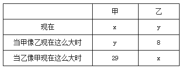 例3:甲乙兩人年齡不等,已知當(dāng)甲像乙現(xiàn)在這么大時(shí),乙8歲;當(dāng)乙像甲現(xiàn)在這么大時(shí),甲29歲。問(wèn)今年甲的年齡為多少歲?( )