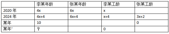 例2:2020年時(shí),李某的年齡是張某的2/3,且正好是自己工齡的4倍。2024年時(shí),張某的年齡正好是自己工齡的2倍,已知張某參加工作時(shí)李某10歲,問(wèn)李某是幾歲參加工作的?( )