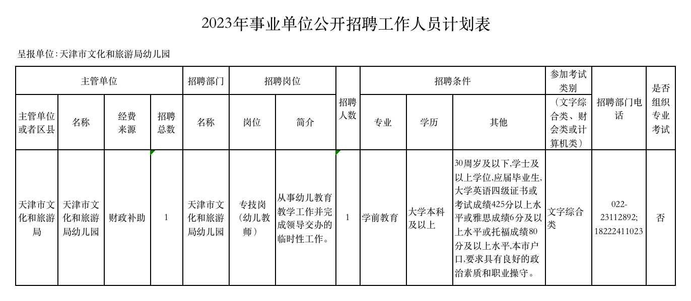 天津市文化和旅游局幼兒園2023年事業(yè)單位公開招聘工作人員方案