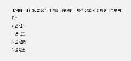 第二步,2021年1月9日跟2020年1月9日相比,因為2020年2月為閏月,所以2021年1月9日星期+2,為星期六。因為1月為大月,所以2021年1月9日到2021年2月9日經(jīng)過了31天,31÷7=4……3,星期+3為星期二。