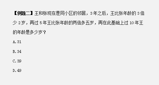 第二步,設(shè)3年后,張的年齡為x歲,則王的年齡為3x-2,再過5年,張為x+5,王為3x+3,根據(jù)王比張的2倍多5歲列方程:3x+3=2(x+5)+5,解得x=12,此時王的年齡為39歲,在此基礎(chǔ)上過10年,王的年齡是39+10=49歲。