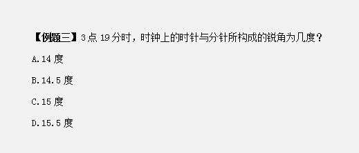 第二步,3點時,分針落后時針90°,經(jīng)過19分鐘,分針比時針多走19×(6°-0.5°)=104.5°,故3點19分所構(gòu)成的銳角為104.5°-90°=14.5°。因此,選擇B選項。