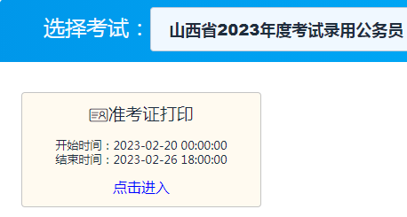 點(diǎn)擊進(jìn)入:2023年山西公務(wù)員考試準(zhǔn)考證打印入口(2月20日至2月26日)