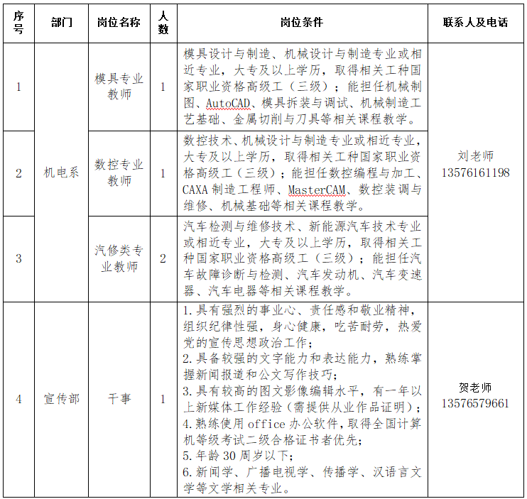江西省輕工業(yè)高級(jí)技工學(xué)校創(chuàng)建于1978年,位于江西省宜春市袁州區(qū)環(huán)城南路199號(hào),是由省教育廳直屬的一所公辦中等職業(yè)學(xué)校、全國重點(diǎn)技工學(xué)校。因?qū)W校發(fā)展和教育教學(xué)需要,現(xiàn)面向社會(huì)招聘外聘專業(yè)教師4名,宣傳部干事1名。