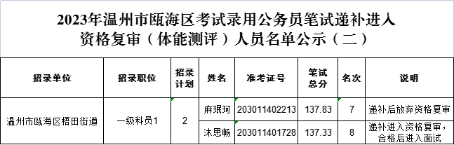 2023年浙江公務(wù)員考試溫州甌海區(qū)遞補資格復(fù)審(體能測評)人員名單公示(二)