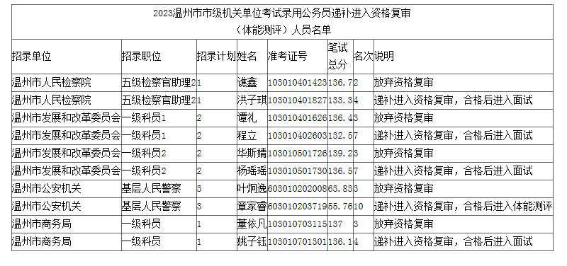 2023溫州市市級機(jī)關(guān)單位考試錄用公務(wù)員遞補(bǔ)進(jìn)入資格復(fù)審(體能測評)人員名單