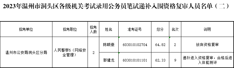 2023年溫州市洞頭區(qū)考試錄用公務(wù)員筆試遞補進入資格復審(體能測評)人員名單公示(二)