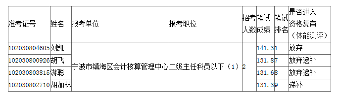 關(guān)于公布2023年鎮(zhèn)海區(qū)各級機(jī)關(guān)單位考試錄用公務(wù)員放棄資格復(fù)審(體能測評)及遞補(bǔ)人員名單的公告(二)