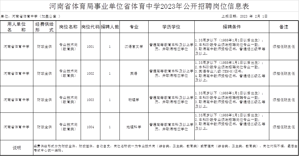 詳見附件《河南省體育中學2023年公開招聘工作人員一覽表》。