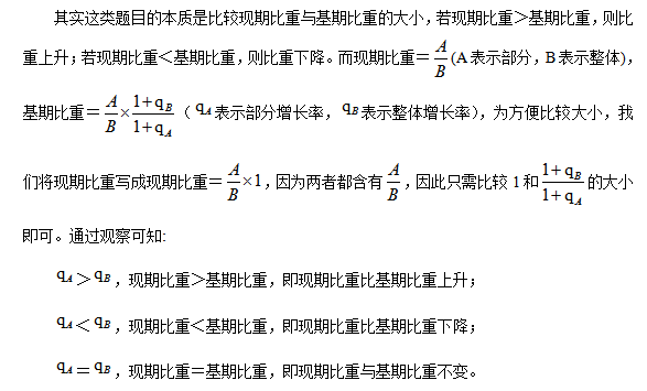 通過(guò)以上兩個(gè)例題相信大家已經(jīng)掌握了判斷比重變化這類題目的解題方法。當(dāng)我們?cè)谟靡陨辖Y(jié)論時(shí)需要注意兩個(gè)點(diǎn):①題目所問(wèn)的上升或下降是現(xiàn)期比重比基期比重還是基期比重比現(xiàn)期比重。②若已知比重的變化情況,也可以利用這個(gè)結(jié)論來(lái)推出
