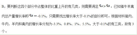 由于部分增長(zhǎng)率為14.1%,整體增長(zhǎng)率為1.9%,部分增長(zhǎng)率大于整體增長(zhǎng)率,則比重上升,排除B、D;再計(jì)算部分增長(zhǎng)率-整體增長(zhǎng)率,即14.1%-1.9%=12.2個(gè)百分點(diǎn),A、C都小于12.2個(gè)百分點(diǎn),