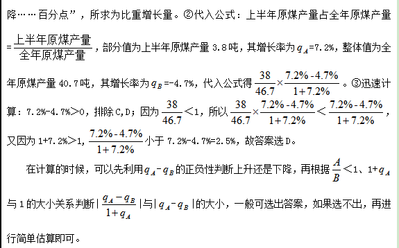 根據(jù)問(wèn)法特征迅速識(shí)別題型,根據(jù)記憶的公式找到相關(guān)數(shù)據(jù)進(jìn)行列式,再由列式特點(diǎn)進(jìn)行判定,排除錯(cuò)誤選項(xiàng),在考場(chǎng)上通過(guò)這三步走,可以有效解決比重變化量的問(wèn)題。其實(shí)資料分析中有很多類似的題目,問(wèn)法特征非常鮮明,根據(jù)列式選用合適的方法計(jì)算或估算,能夠迅速解決。