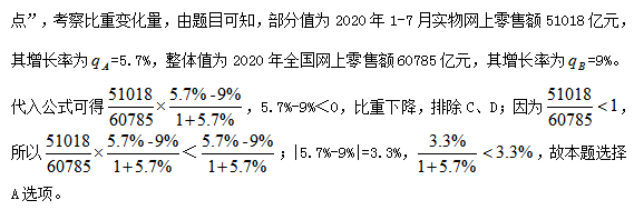 例題:2020年1-7月份,全國(guó)網(wǎng)上零售額60785億元,同比增長(zhǎng)9.0%,比1-6月提高1.7個(gè)百分點(diǎn)。其中,實(shí)物商品網(wǎng)上零售額51018億元,增長(zhǎng)5.7%。