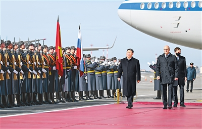 俄方在機(jī)場舉行隆重迎賓儀式。軍樂團(tuán)奏中俄兩國國歌。習(xí)近平檢閱俄羅斯三軍儀仗隊(duì)并觀看分列式。