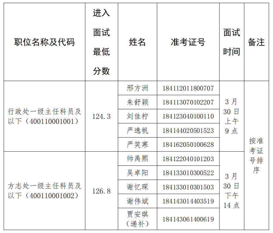 行政處一級(jí)主任科員及以下崗位(400110001001)面試于2023年3月30日(周四)上午9:00開始,方志處一級(jí)主任科員及以下崗位(400110001002)面試于2023年3月30日(周四)下午14:00開始,請(qǐng)參加面試的考生于當(dāng)日提前30分鐘到面試地點(diǎn)報(bào)到。不按規(guī)定時(shí)間進(jìn)入候考室的考生,取消考試資格。