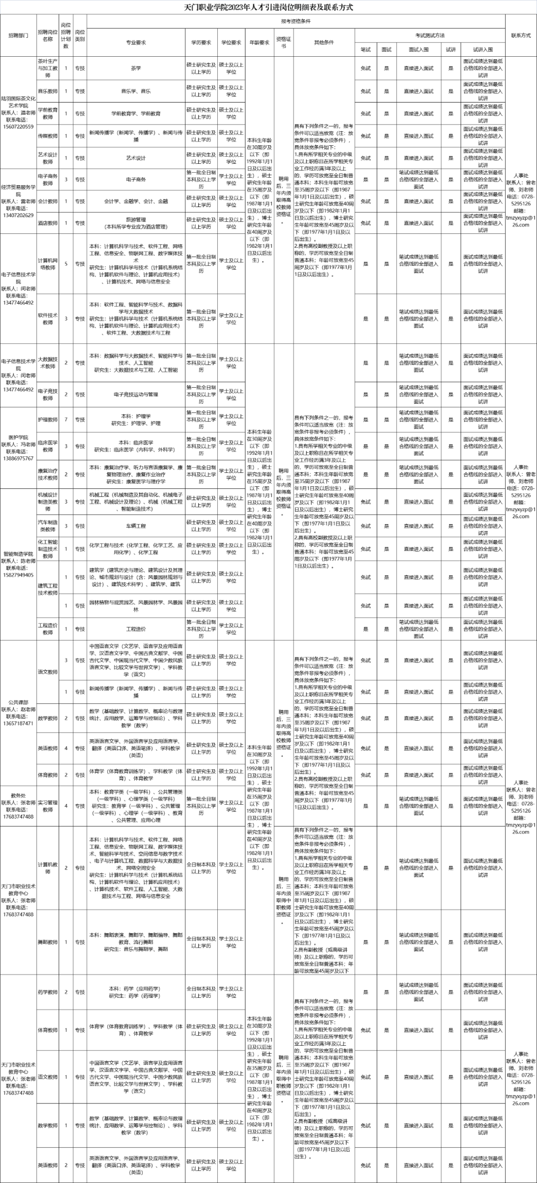 1.招聘崗位、招聘人數(shù)、專業(yè)要求、學(xué)歷層次及崗位相關(guān)要求詳見《天門職業(yè)學(xué)院2023年人才引進(jìn)崗位明細(xì)表及聯(lián)系方式》(附件1)。
