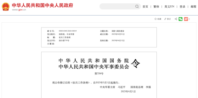 2023年4月12日,國務(wù)院網(wǎng)站公布新修訂的《征兵工作條例》: