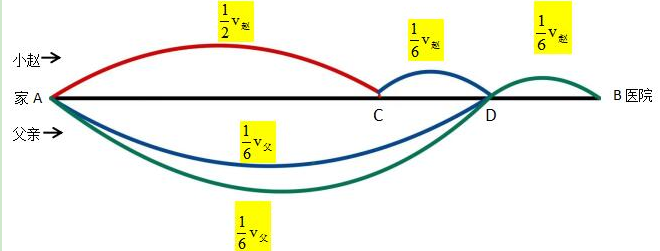 例題:小趙騎車去醫(yī)院看病,父親在發(fā)現(xiàn)小趙沒(méi)有帶醫(yī)??〞r(shí)以60km/h的速度開(kāi)車追上小趙,把醫(yī)??ń唤o他并立即返回。小趙拿到醫(yī)??ê笥烛T了10分鐘到達(dá)醫(yī)院,小趙父親也同時(shí)到家。假如小趙從家到醫(yī)院一共用時(shí)50分鐘,則小趙的速度為多少km/h?(假定小趙及其父親全程都勻速行駛,忽略父子二人交接卡的時(shí)間)( )