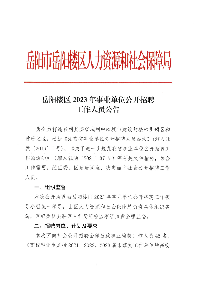 2023年湖南岳陽市岳陽樓區(qū)事業(yè)單位招聘45人公告
