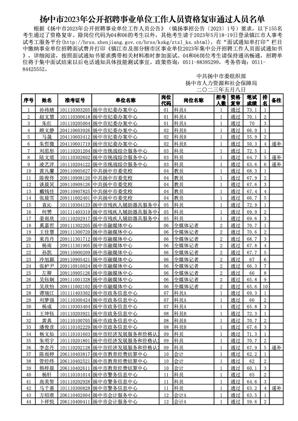 2023年江蘇鎮(zhèn)江揚(yáng)中市事業(yè)單位招聘資格復(fù)審?fù)ㄟ^名單