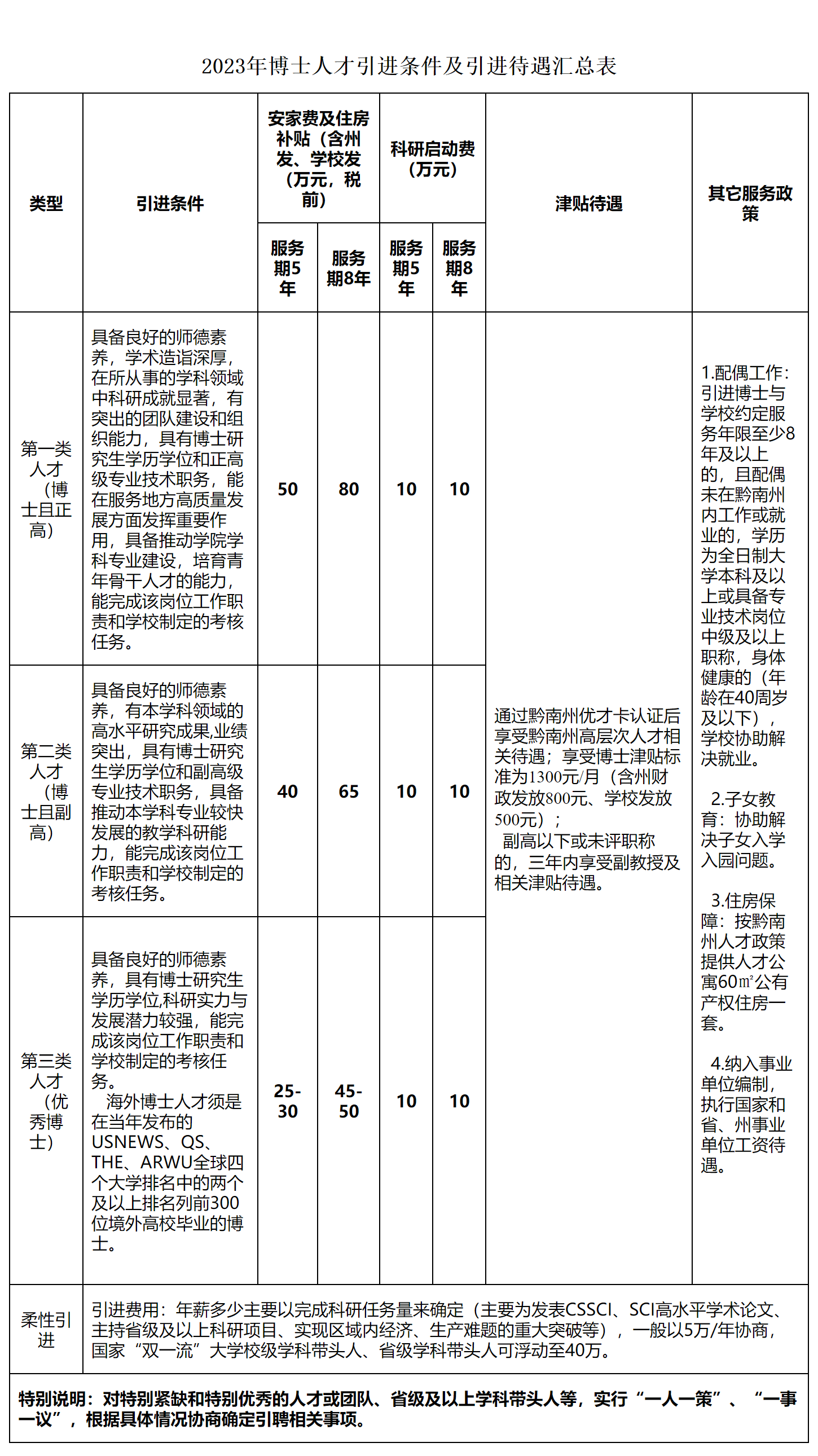 2023年博士人才引進(jìn)條件及引進(jìn)待遇匯總表類型引進(jìn)條件安家費(fèi)及住房補(bǔ)貼(含州發(fā)、學(xué)校發(fā)(萬元,稅前)科研啟動費(fèi)(萬元)津貼待遇其它服務(wù)政策服務(wù)期5年服務(wù)期8年服務(wù)期5年服務(wù)期8年第一類人才(博士且正高)具備良好的師德素養(yǎng),學(xué)術(shù)造詣深厚,在所從事的學(xué)科領(lǐng)域中科研成就顯著,有突出的團(tuán)隊建設(shè)和組織能力,具有博士研究生學(xué)歷學(xué)位和正高級專業(yè)技術(shù)職務(wù),能在服務(wù)地方高質(zhì)量發(fā)展方面發(fā)揮重要作用,具備推動學(xué)院學(xué)科專業(yè)建設(shè),培育青年骨干人才的能力,能完成該崗位工作職責(zé)和學(xué)校制定的考核任務(wù)。50801010通過黔南州優(yōu)才卡認(rèn)證后享受黔南州高層次人才相關(guān)待遇;享受博士津貼標(biāo)準(zhǔn)為1300元/月(含州財政發(fā)放800元、學(xué)校發(fā)放500元);副高以下或未評職稱的,三年內(nèi)享受副教授及相關(guān)津貼待遇。1.配偶工作:引進(jìn)博士與學(xué)校約定服務(wù)年限至少8年及以上的,且配偶未在黔南州內(nèi)工作或就業(yè)的,學(xué)歷為全日制大學(xué)本科及以上或具備專業(yè)技術(shù)崗位中級及以上職稱,身體健康的(年齡在40周歲及以下),學(xué)校協(xié)助解決就業(yè)。 2.子女教育:協(xié)助解決子女入學(xué)入園問題。 3.住房保障:按黔南州人才政策提供人才公寓60㎡公有產(chǎn)權(quán)住房一套。 4.納入事業(yè)單位編制,執(zhí)行國家和省、州事業(yè)單位工資待遇。第二類人才(博士且副高)具備良好的師德素養(yǎng),有本學(xué)科領(lǐng)域的高水平研究成果,業(yè)績突出,具有博士研究生學(xué)歷學(xué)位和副高級專業(yè)技術(shù)職務(wù),具備推動本學(xué)科專業(yè)較快發(fā)展的教學(xué)科研能力,能完成該崗位工作職責(zé)和學(xué)校制定的考核任務(wù)。40651010第三類人才(優(yōu)秀博士)具備良好的師德素養(yǎng),具有博士研究生學(xué)歷學(xué)位,科研實(shí)力與發(fā)展?jié)摿^強(qiáng),能完成該崗位工作職責(zé)和學(xué)校制定的考核任務(wù)。 海外博士人才須是在當(dāng)年發(fā)布的USNEWS、QS、THE、ARWU全球四個大學(xué)排名中的兩個及以上排名列前300位境外高校畢業(yè)的博士。25-3045-501010柔性引進(jìn)引進(jìn)費(fèi)用:年薪多少主要以完成科研任務(wù)量來確定(主要為發(fā)表CSSCI、SCI高水平學(xué)術(shù)論文、主持省級及以上科研項目、實(shí)現(xiàn)區(qū)域內(nèi)經(jīng)濟(jì)、生產(chǎn)難題的重大突破等),一般以5萬/年協(xié)商,國家“雙一流”大學(xué)校級學(xué)科帶頭人、省級學(xué)科帶頭人可浮動至40萬。特別說明:對特別緊缺和特別優(yōu)秀的人才或團(tuán)隊、省級及以上學(xué)科帶頭人等,實(shí)行“一人一策”、“一事一議”,根據(jù)具體情況協(xié)商確定引聘相關(guān)事項。