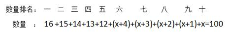 根據(jù)和定最值問(wèn)題的解題原則:若要求某個(gè)量為最大,其他量要盡量小。要排名最后的城市專(zhuān)賣(mài)店數(shù)量最多,那么其他城市專(zhuān)賣(mài)店數(shù)量要盡可能地少。題目中唯一確定量,就是數(shù)量第五多的城市有12家,如果數(shù)量第一多到第四多城市的專(zhuān)賣(mài)店數(shù)量要想盡量小,且數(shù)量不一樣,還要比數(shù)量第五的城市大,那么就應(yīng)該是16,15,14,13家;同理,數(shù)量第六多到數(shù)量排名第十一要盡量小,且都比數(shù)量排名最后的城市大,那么每個(gè)城市的專(zhuān)賣(mài)店數(shù)量盡可能地接近。根據(jù)這個(gè)思想,我們可以設(shè)數(shù)量排名最后的城市有x家專(zhuān)賣(mài)店,數(shù)量第六多到數(shù)量排名第九的城市可設(shè)為x+4、x+3、x+2、x+1。我們把10家城市的專(zhuān)賣(mài)店數(shù)量已經(jīng)分別設(shè)置好未知數(shù)和常量,總和為100,故有: