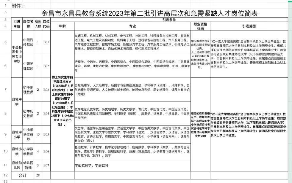1.金昌市永昌縣教育系統(tǒng)2023年第二批引進高層次和急需緊缺人才崗位簡表