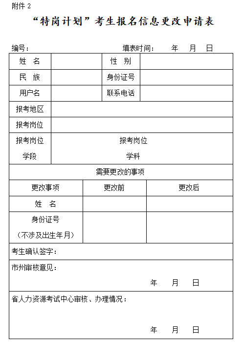 報考人員申請更改姓名及身份證號信息,須向區(qū)教育局提交本人有效居民身份證原件并填寫《考生報名信息更改申請表》,由區(qū)教育局報市教育局匯總后報省教育廳協(xié)調(diào)省人力資源考試中心審核修改。姓名或身份證號僅能修改兩類:一是報考人員姓名中的錯別字,主要指同音字、形似字等;二是報考人員身份證號中不涉及出生年月的個別錯誤數(shù)字。姓名或身份證號修改截止日期為2023年6月2日18:00,市教育局提交報考信息修改截止日期為2023年6月3日11:30前,逾期均不予受理。