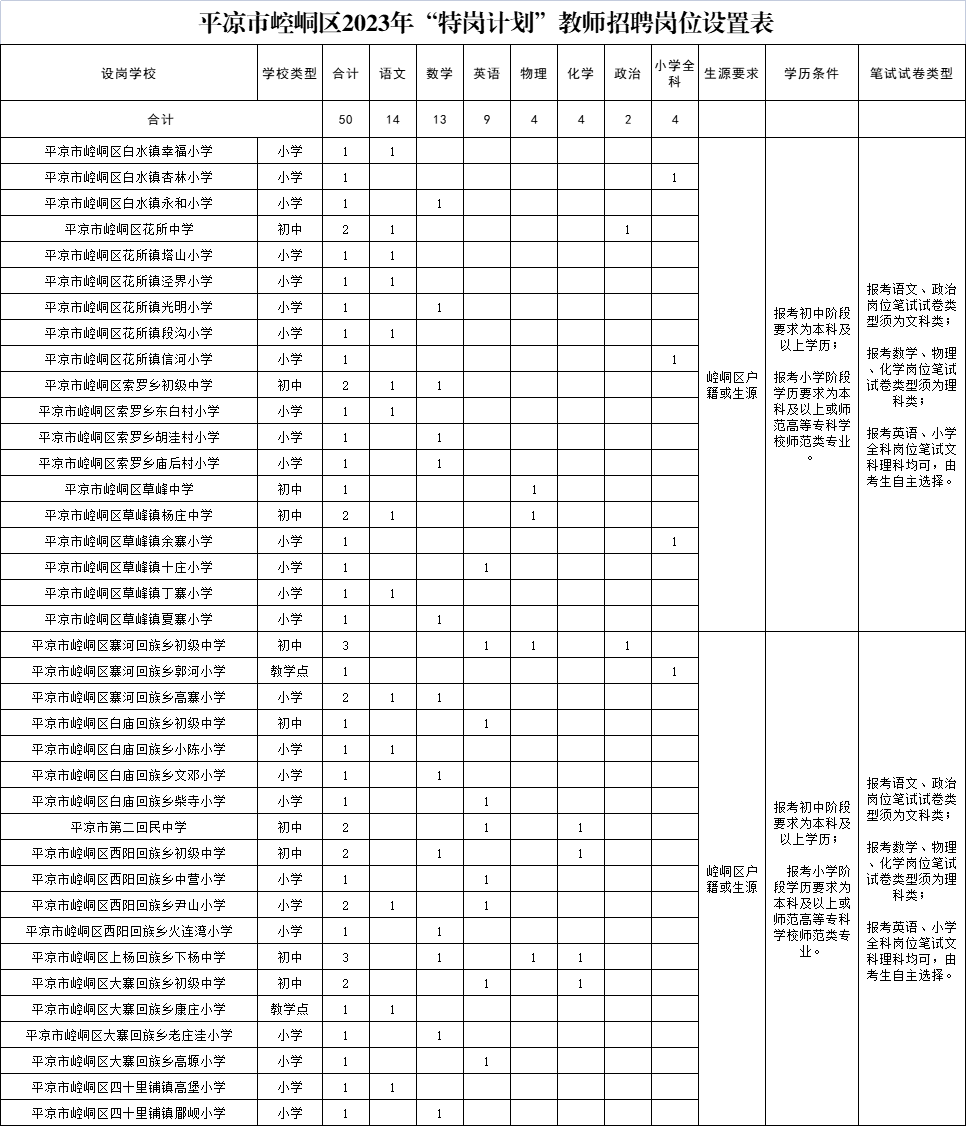 平?jīng)鍪嗅轻紖^(qū)2023年農(nóng)村義務(wù)教育階段學(xué)校教師特設(shè)崗位計劃招聘公告