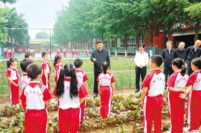 隨后,習(xí)近平來(lái)到學(xué)生農(nóng)場(chǎng)。這里是學(xué)生開(kāi)展農(nóng)業(yè)種植活動(dòng)的實(shí)踐場(chǎng)所,陽(yáng)光下、田壟上,一排排綠油油的菜苗生機(jī)勃勃。孩子們拿著水桶、鏟子、耙子、毛筆,為西紅柿、黃瓜等澆水、松土、除草、授粉。習(xí)近平強(qiáng)調(diào),很多知識(shí)和道理都來(lái)自勞動(dòng)、來(lái)自生活。引導(dǎo)孩子們從小樹(shù)立勞動(dòng)觀念,培養(yǎng)勞動(dòng)習(xí)慣,提高勞動(dòng)能力,有利于他們更好地學(xué)習(xí)知識(shí)?,F(xiàn)在一些城里的孩子接觸農(nóng)村、接觸大自然少,不光“四體不勤”,而且“五谷不分”,對(duì)吃的是什么、從哪里來(lái)的、怎么來(lái)的都不知道,更體會(huì)不到“誰(shuí)知盤(pán)中餐,粒粒皆辛苦”。他對(duì)同學(xué)們說(shuō),認(rèn)識(shí)大自然,首先要從認(rèn)識(shí)身邊的植物開(kāi)始。同學(xué)們?cè)耘嗟母鞣N植物,雖然書(shū)本上都有介紹,但大家親手種、親自培育、跟蹤觀察,收獲肯定是不一樣的。希望同學(xué)們從“學(xué)農(nóng)”中感受到農(nóng)作的艱辛和農(nóng)民的不易,從小養(yǎng)成熱愛(ài)勞動(dòng)、珍愛(ài)糧食、尊重自然的良好習(xí)慣,為建設(shè)美麗中國(guó)作貢獻(xiàn)。新時(shí)代生態(tài)文明建設(shè)要從娃娃抓起,通過(guò)生動(dòng)活潑的勞動(dòng)體驗(yàn)課程,讓孩子親自動(dòng)手、親身體驗(yàn)、自我感悟,讓“綠水青山就是金山銀山”的理念早早植入孩子的心靈。