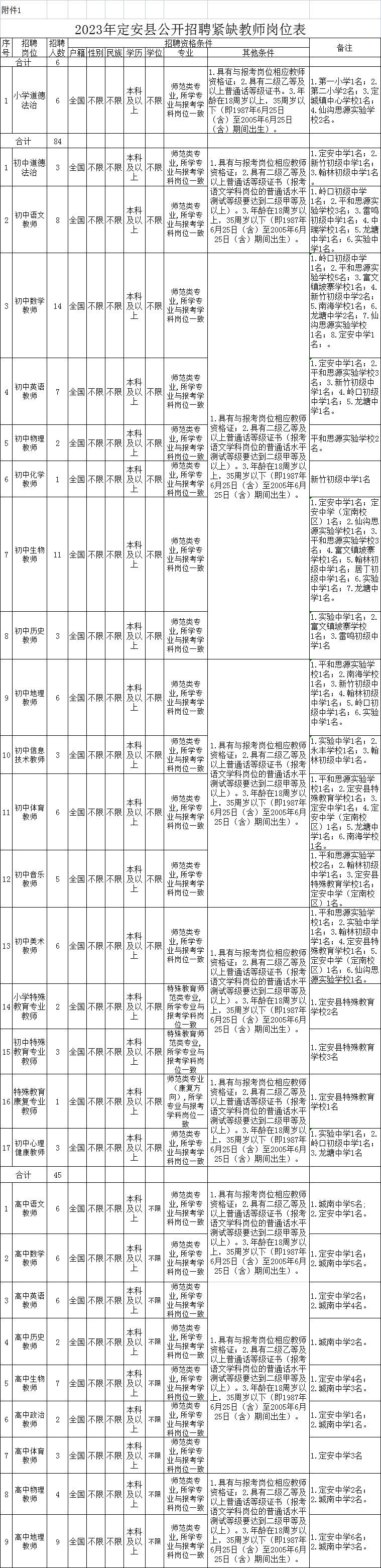 我縣計(jì)劃公開招聘教師135名,其中,高中教師45名、初中教師84名、小學(xué)教師6名(詳見附件1)。