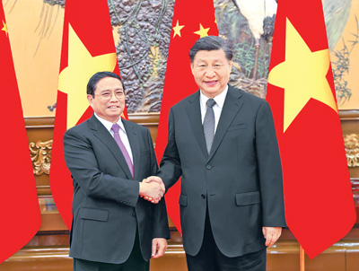 習(xí)近平指出,去年中共二十大閉幕后,我邀請阮富仲總書記來訪,共同為中越關(guān)系發(fā)展定向把舵。今年是中越建立全面戰(zhàn)略合作伙伴關(guān)系15周年,兩國各層級交往日益密切,我同阮富仲總書記達(dá)成的共識正在得到落實(shí)。中方視越方為周邊外交的優(yōu)先方向和具有戰(zhàn)略意義的命運(yùn)共同體,這是中方基于兩國關(guān)系長遠(yuǎn)發(fā)展作出的戰(zhàn)略選擇。面對日益嚴(yán)峻復(fù)雜的國際形勢,中越兩國要秉持平等互利、團(tuán)結(jié)互信、合作共贏精神,攜手合作、共謀發(fā)展,更好造福兩國人民,為變亂交織的世界注入更多穩(wěn)定性。