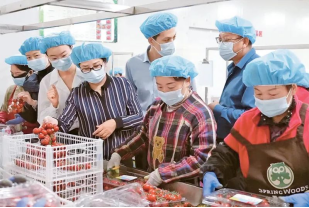 圖為2023年5月15日,云南大理春沐源農(nóng)業(yè)科技有限公司包裝車間內(nèi),中華全國總工會(huì)赴云南蹲點(diǎn)工作組開展“進(jìn)車間勞動(dòng)交工人朋友”實(shí)踐活動(dòng),深入公司生產(chǎn)一線,與工人一同進(jìn)行產(chǎn)品包裝。云南省總工會(huì)供圖王自強(qiáng)/攝