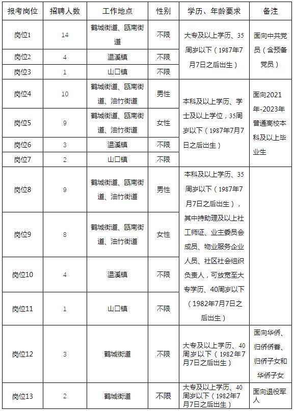 2.報名時需攜帶:(1)本人身份證、戶口本、學(xué)歷證書原件及復(fù)印件各1份,未取得畢業(yè)證書的2023年應(yīng)屆畢業(yè)生,須提供《就業(yè)推薦表》和《全國普通高校畢業(yè)生就業(yè)協(xié)議書》;(2)2寸個人免冠彩色照片1張;(3)報考崗位要求為中共黨員的,需提交所在黨組織提供的黨員身份證明;報名崗位要求“退役軍人”的需提交退役證及復(fù)印件各1份;報考崗位要求華僑、歸僑僑眷、歸僑子女、華僑子女的,需攜帶護(hù)照和居留復(fù)印件,關(guān)系證明(戶口本、出生證、公證書等能直接證明其親屬關(guān)系的)、報名表到青田縣統(tǒng)戰(zhàn)部(僑辦)審核蓋章;報名條件要求“持助理及以上社工師證”的需提交證書及復(fù)印件各1份;報名條件要求“業(yè)主委員會成員”的需青田縣住房和城鄉(xiāng)建設(shè)局在報名表上審核蓋章;報名條件要求“社區(qū)社會組織負(fù)責(zé)人”的需青田縣民政局在報名表上審核蓋章;報名條件要求“物業(yè)服務(wù)企業(yè)人員”的需提供社保繳費(fèi)證明和工作證明;(4)報名表一份《青田縣招聘專職社區(qū)工作者報名表》(附表自行下載)。