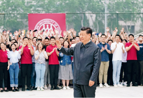 2022年4月25日上午,中共中央總書記、國家主席、中央軍委主席習(xí)近平來到中國人民大學(xué)考察調(diào)研。這是習(xí)近平向師生們揮手致意。新華社記者謝環(huán)馳/攝