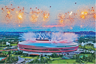 2023年7月28日晚,第31屆世界大學(xué)生夏季運(yùn)動(dòng)會(huì)開幕式在成都東安湖體育公園主體育場舉行。圖為開幕式焰火。新華社記者黃偉/攝