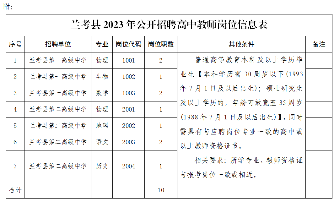 本次計(jì)劃招聘高中教師10名,具體崗位見《蘭考縣2023年公開招聘高中教師崗位信息表》(附件)。