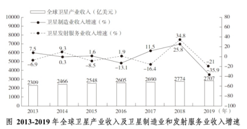 問題:以2012年為基期,2019年全球衛(wèi)星制造業(yè)、衛(wèi)星發(fā)射服務(wù)業(yè)的收入增長情況分別是:( )