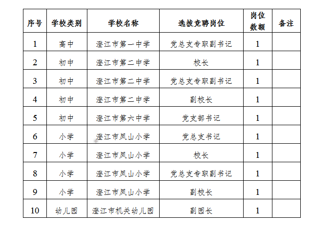 選拔競聘工作在市委教育工作領導小組領導下進行,市委組織部和市教育體育局具體負責組織實施,市委編辦、市人社局等部門配合,按照“公開、平等、競爭、擇優(yōu)”的原則,對部分學校領導人員崗位實行公開選拔競聘。其中,高中學校副職1名;初中學校正職2名、副職2名;小學學校正職2名、副職2名,幼兒園副職1名。具體崗位如下: