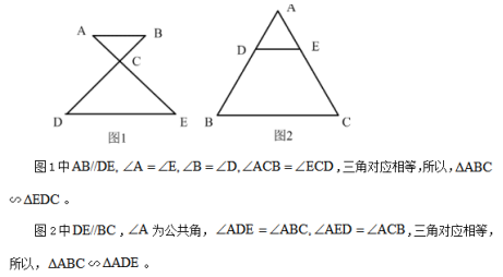 相似三角形:當(dāng)兩個三角形三角對應(yīng)相等或三邊對應(yīng)成比例,則稱這兩個三角形為相似三角形。而在我們常見的題目中,相似三角形往往是伴隨著平行出現(xiàn)的,比如最常見的兩種相似三角形如下圖所示: