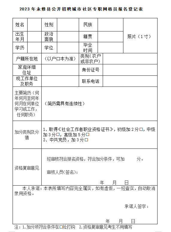 附件:永修縣2023年公開(kāi)選聘城市社區(qū)專(zhuān)職網(wǎng)格員報(bào)名登記表