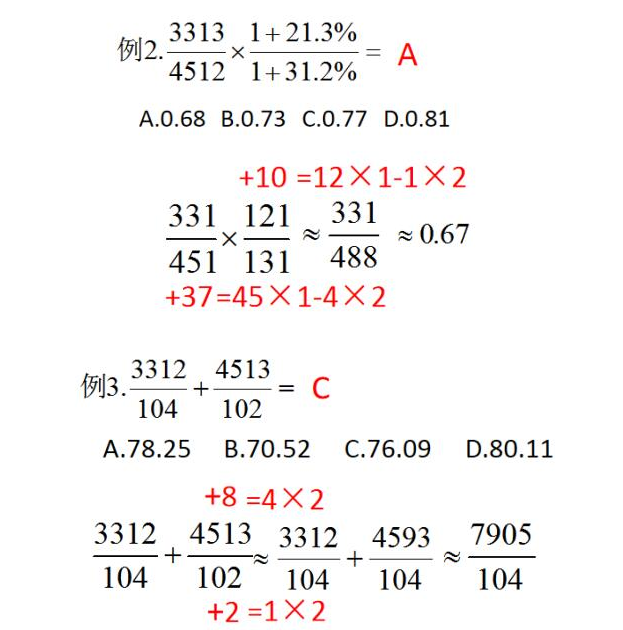 (1)首數(shù)法:當(dāng)存在除法算式且對應(yīng)選項的首一位或者首兩位就不一樣時,我們就可以直除得出答案;