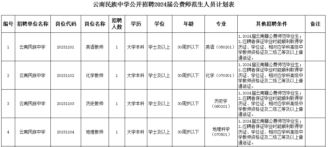 英語(yǔ)1人、化學(xué)1人、歷史1人、地理1人。具體崗位要求見《云南民族中學(xué)公開招聘2024屆公費(fèi)師范生人員計(jì)劃表》。