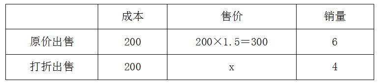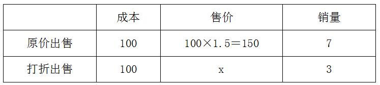 【例1】某家具店購(gòu)進(jìn)一批桌椅,每套進(jìn)價(jià)200元,按期望獲利50%定價(jià)出售。賣(mài)掉這批桌椅的60%以后,店主為提前收回資金,打折出售余下的桌椅。售完全部桌椅后,實(shí)際利潤(rùn)比期望利潤(rùn)低了18%。問(wèn)余下的桌椅是打幾折出售的?( )