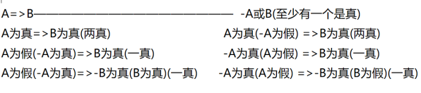 假言A=>B,它的矛盾命題是聯(lián)言A且非B。而這個聯(lián)言命題的矛盾命題是選言-A或B