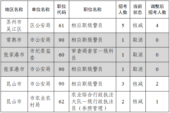 根據(jù)《蘇州市2024年度考試錄用公務(wù)員簡章》及有關(guān)規(guī)定,以下職位因有效報名人數(shù)達不到開考比例,須核減、取消相應(yīng)計劃,具體如下: