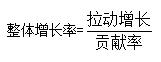 拉動增長用于分析某部分的增長量拉動整體增長程度的指標,一般指整體中某部分的增長量與整體基期值的比值,公式如下:
