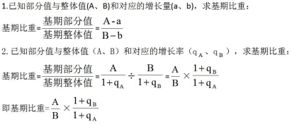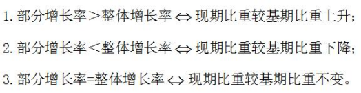 根據(jù)公式,我們可以清晰的判斷,如果部分增長(zhǎng)率>整體增長(zhǎng)率,則比重增長(zhǎng)量為正,即比重上升,反之亦成立。
