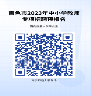 2023年11月23日18:00至12月1日18:00前,有意向參加南寧師范大學(xué)專(zhuān)場(chǎng)的應(yīng)聘人員可通過(guò)網(wǎng)絡(luò)進(jìn)行預(yù)報(bào)名,使用QQ或微信掃描《百色市2023年秋季面向應(yīng)屆大學(xué)畢業(yè)生招聘中小學(xué)教師公告》中的二維碼,如實(shí)填寫(xiě)個(gè)人相關(guān)信息,并提交報(bào)名表。每個(gè)專(zhuān)場(chǎng)應(yīng)聘人員只能填報(bào)一個(gè)崗位;在廣西師范大學(xué)專(zhuān)場(chǎng)完成招聘的崗位,南寧師范大學(xué)專(zhuān)場(chǎng)不再安排現(xiàn)場(chǎng)報(bào)名和招聘。