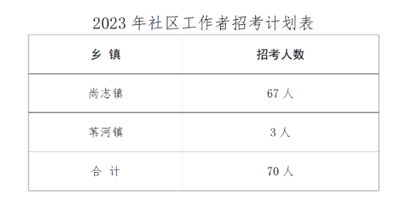 此次全市面向社會(huì)公開(kāi)招考社區(qū)工作者70人。具體招聘數(shù)量詳見(jiàn)附件《2023年尚志市面向社會(huì)招錄社區(qū)工作者計(jì)劃表》。